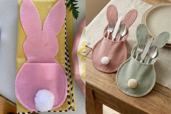 Például varrhatsz nyuszis evőeszköztartót az ünnepi asztalra. Ehhez csak egy egyszerű nyuszi formát kell kivágni filcből, majd körben összevarrni pelenkaöltéssel úgy, hogy felül hely maradjon az evőeszközöknek. Egy kis pompon vagy gomb lehet a nyuszi farka, és már kész is a kedves húsvéti dekor.