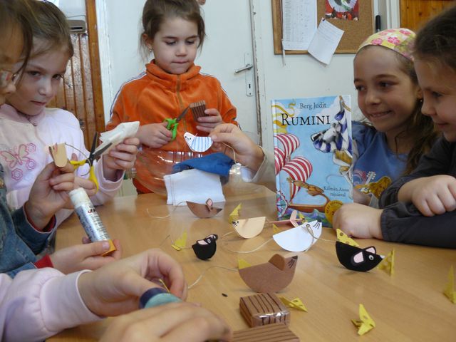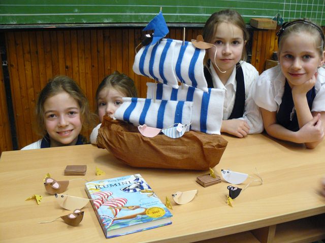 A Hajdúböszörményi Bocskai István Általános Iskola és Városi Sportiskola 1.b osztálya a csatolt képekkel igazolt pályaművel indul a Keltsük életre a betűket! pályázatban. A debreceni imami weboldalon 15 szülő regisztrált, így a Berg Judit: Rumini című könyv alapján elsőseinkkel megalkottuk a Szélkirálynő hajóját, fedélzetén Ruminivel, Balikóval és a hajó további legénységével együtt.Mi nem lemásolni szerettük volna a piros árbócos hajót, hanem Hajdúböszörmény zászlajának kék-fehér színeit alapul véve, városunkhoz való tartozásunkat is beleszőttük e pályaműbe. A hajó, mint látják műanyag olajosflakonból készült, az egerek papírból, mind a gyerekek keze által és a tanító nénik segítségével.
